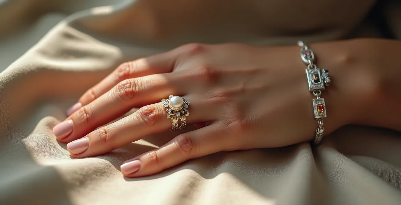 Wie die obige Komposition andeutet, kann die Kombination von Gegensätzen eine faszinierende Spannung erzeugen. Versuchen Sie, ein zartes, filigranes Erbstück mit einem modernen, geometrischen Ring zu tragen. Mischen Sie die Wärme von Gold mit der Kühle von Silber. Dieser bewusste Stilbruch kann eine Facette Ihrer Persönlichkeit hervorheben – vielleicht die Verbindung von Tradition und Moderne, von Stärke und Sanftheit. Der Trick besteht darin, ein verbindendes Element zu finden: Das kann ein wiederkehrendes Motiv, eine ähnliche Metallfarbe oder einfach ein Gefühl sein, das die Stücke vereint.
